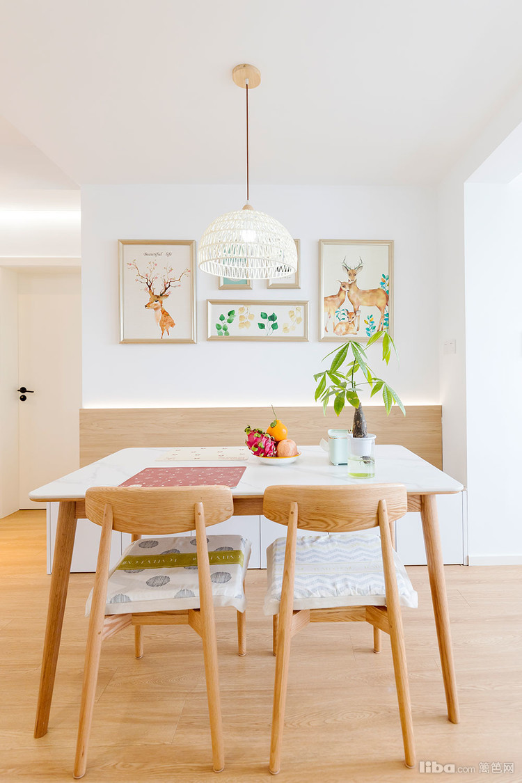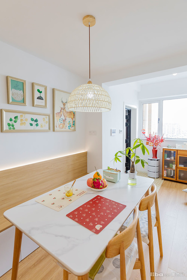 餐厅上方的吊灯很特别,是纯手工 编织的灯罩,清新素雅和屋里的风格特别搭。