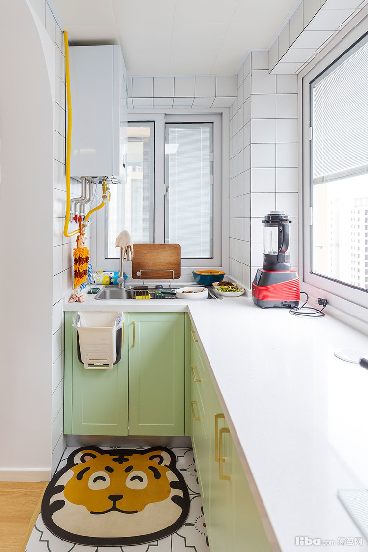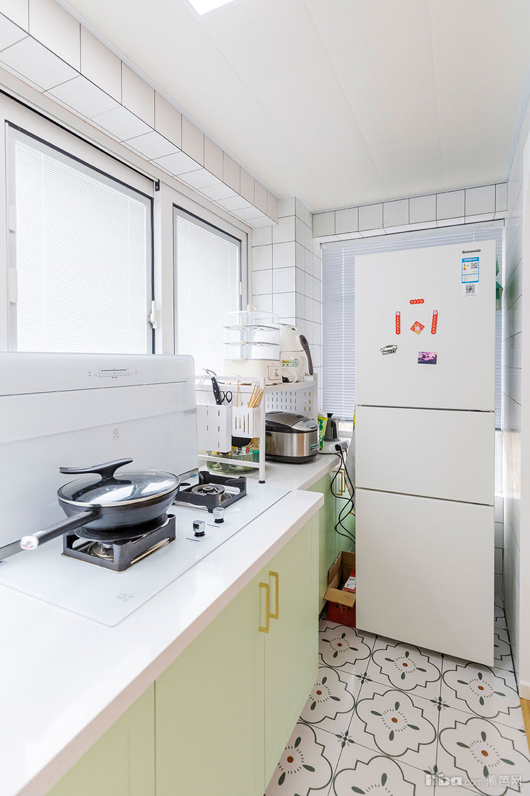 厨房的风格和卫生间是统一的,小花砖搭配淡绿色的橱柜,网红小白格瓷砖清新淡雅。