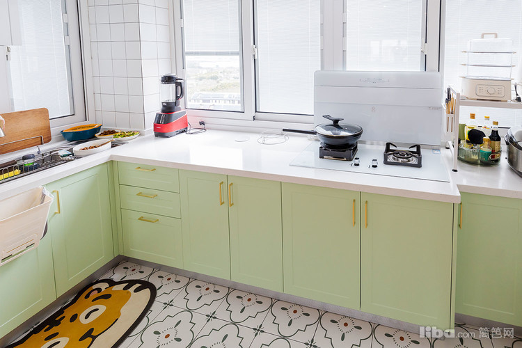 抹茶绿色调的橱柜,极简的边框,耐看又小清新。L型的厨房设计,把洗切烹菜区都规划的美美的。