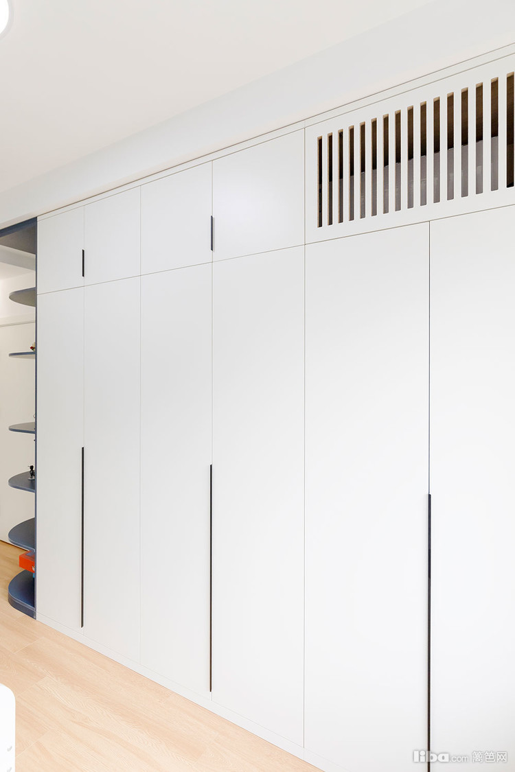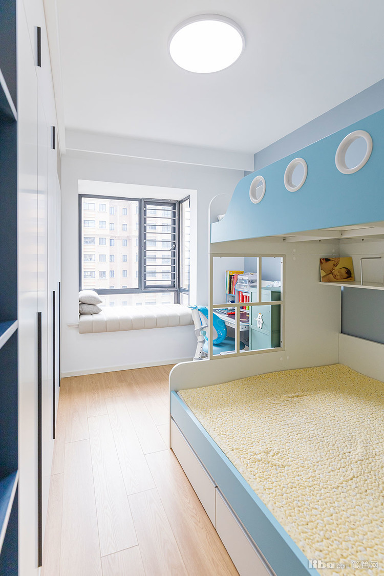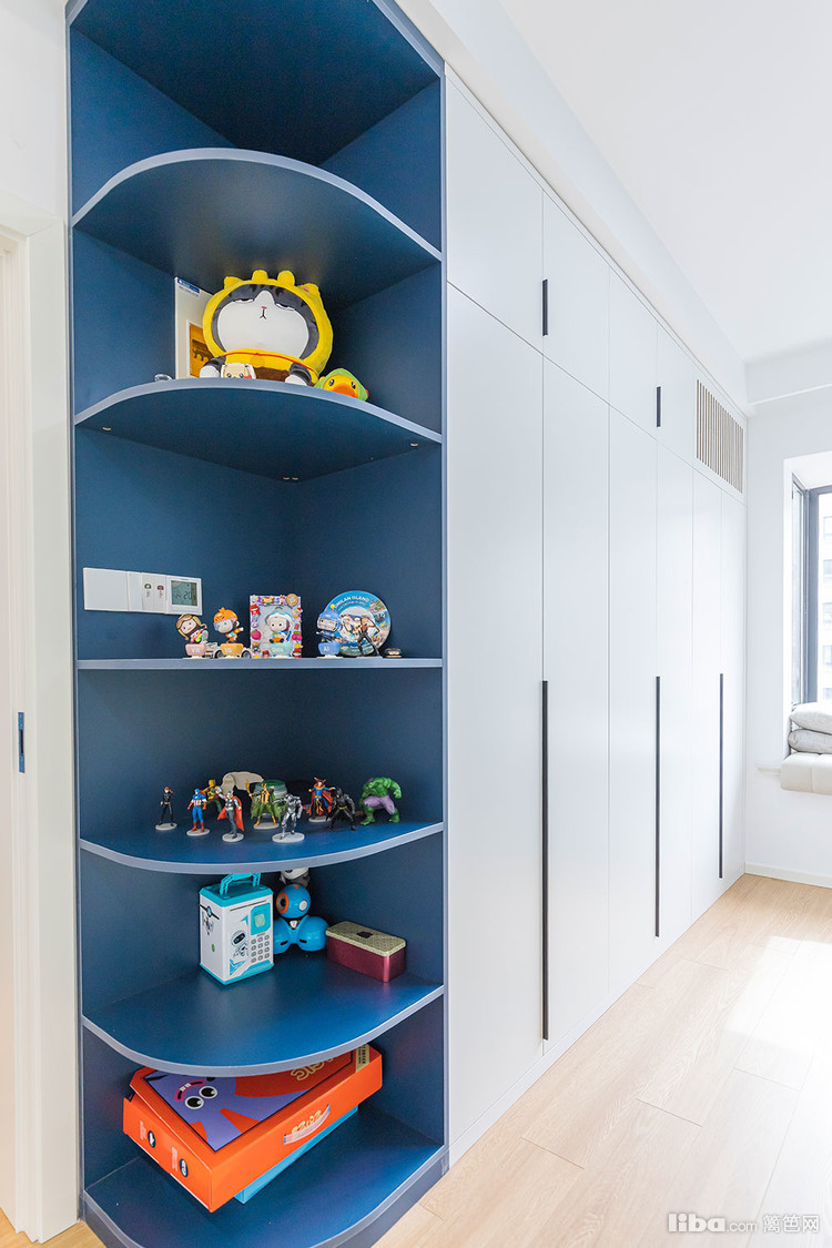 这里就是儿童房啦,小男孩的房间选择蓝色和白色搭配。一门到顶的满墙衣柜,可以收纳小孩子超多的衣物。
