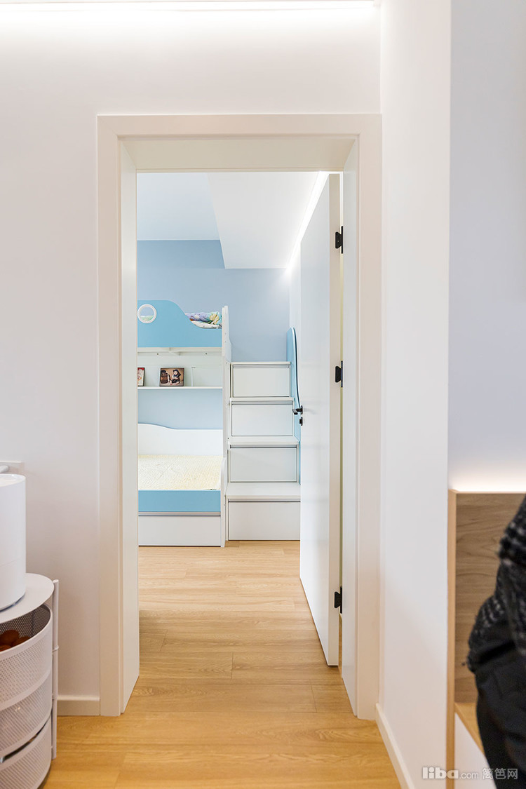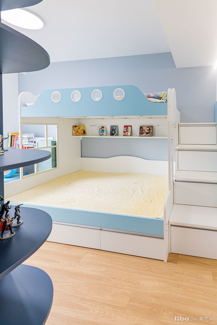 儿童房的床是上下铺,天蓝色的床照型活泼可爱,楼梯还有收纳功能。