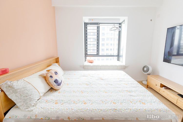 开这个隐形门就是主卧,整个空间的色调依旧是小清新。木质的地板和床,这个床头的背景墙颜色很漂亮,淡淡的粉橘色,和木质材质很搭,给人一种暖暖的氛围感。