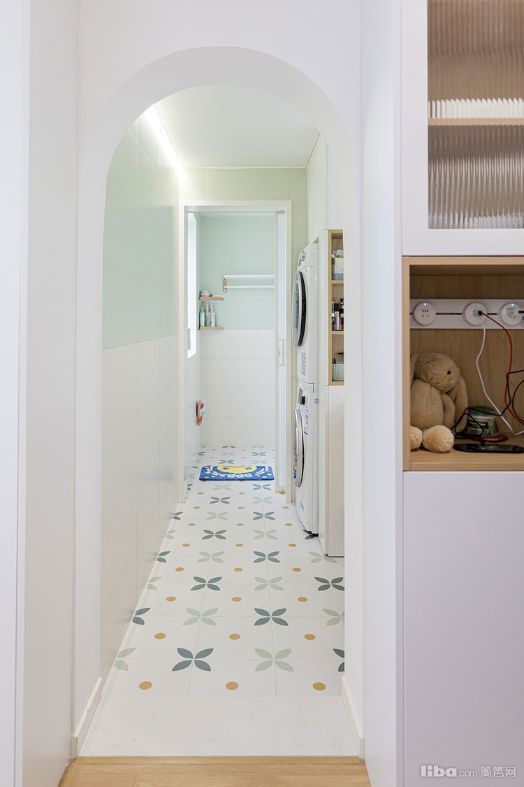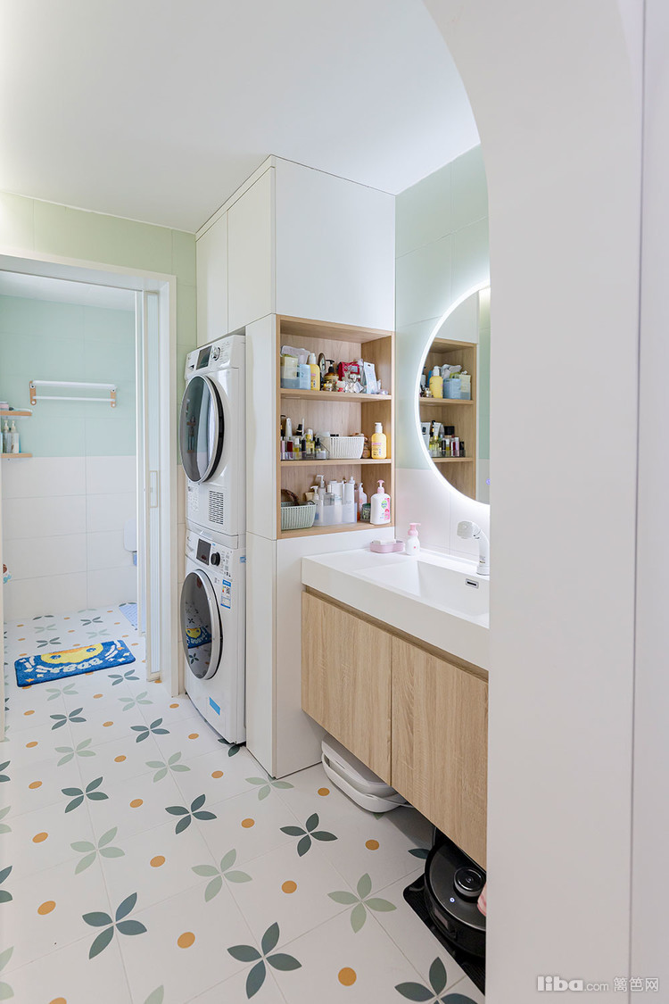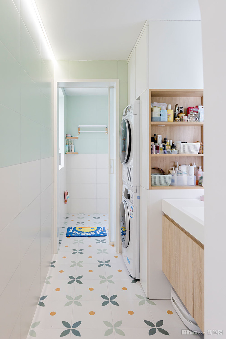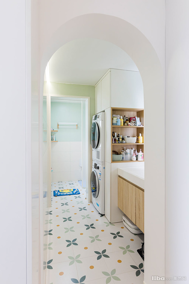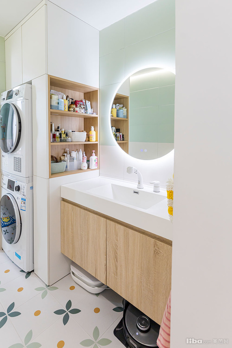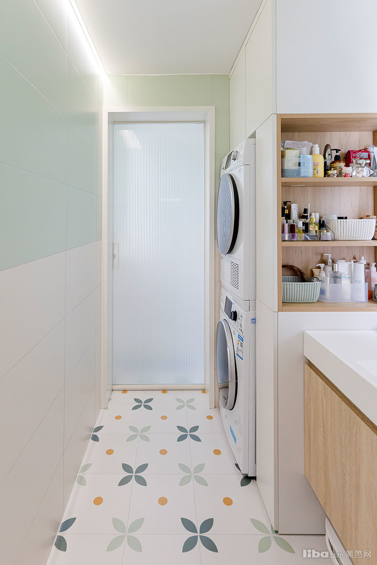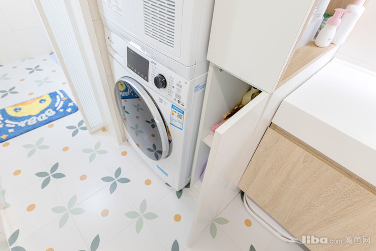洗衣区做了嵌入式洗衣柜 上柜收纳一些大件的清洁工具 下柜嵌入洗烘一体机
