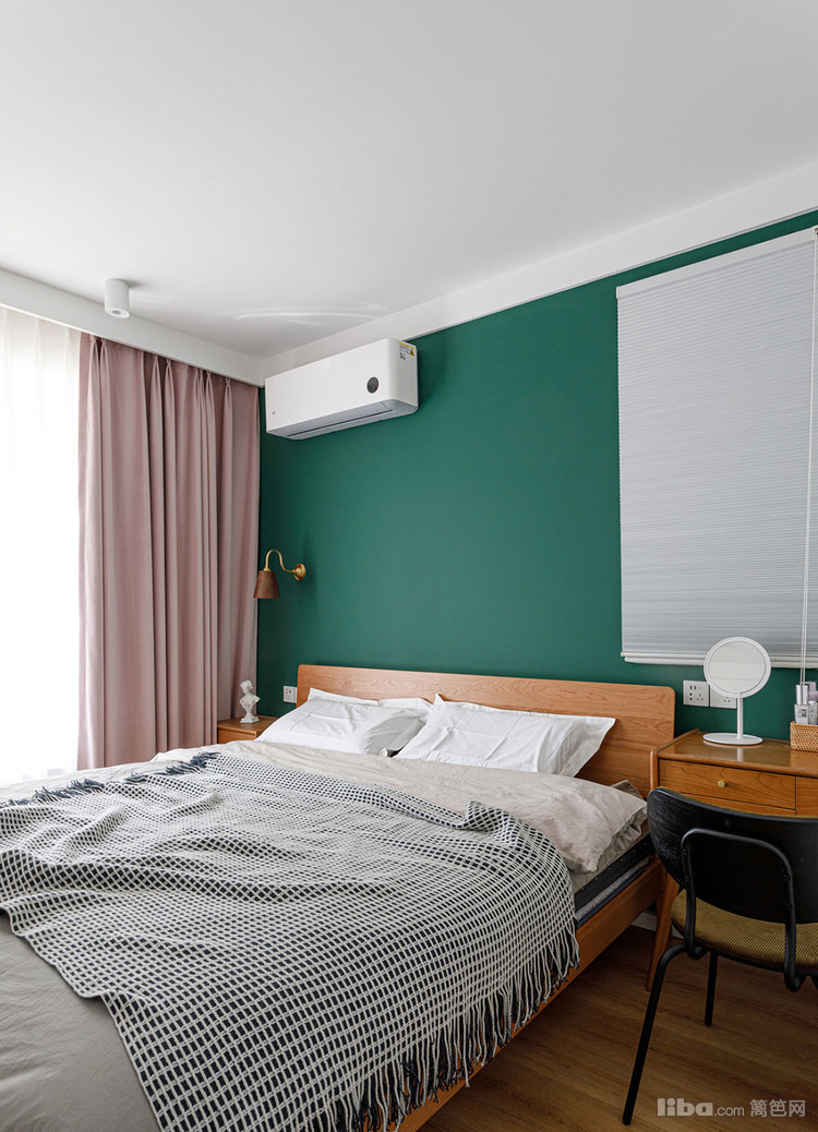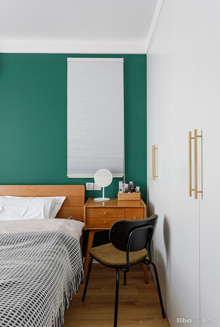 白色的衣柜嵌在墙体内,中和了绿色的浓烈。