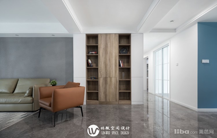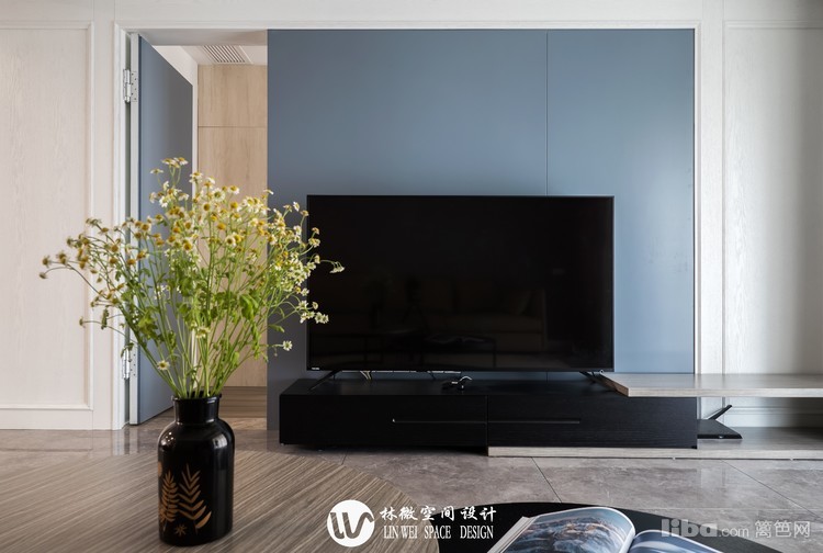 雾霾蓝的电视背景墙大有玄机,轻推左侧,便能开启通往另一个空间的门。
