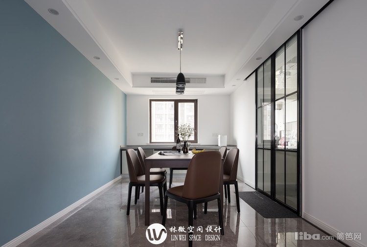 温柔的蓝色墙壁富有生机,棕色的餐桌餐椅质地细腻,触感如同丝滑的巧克力