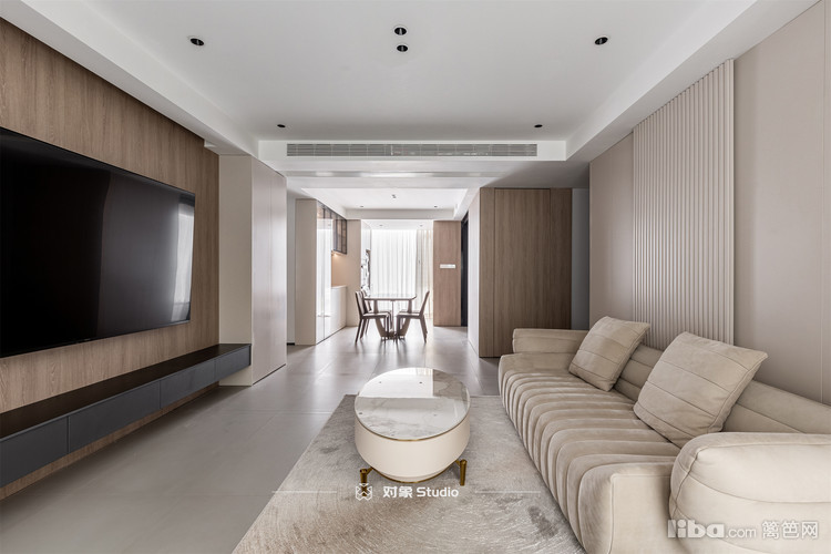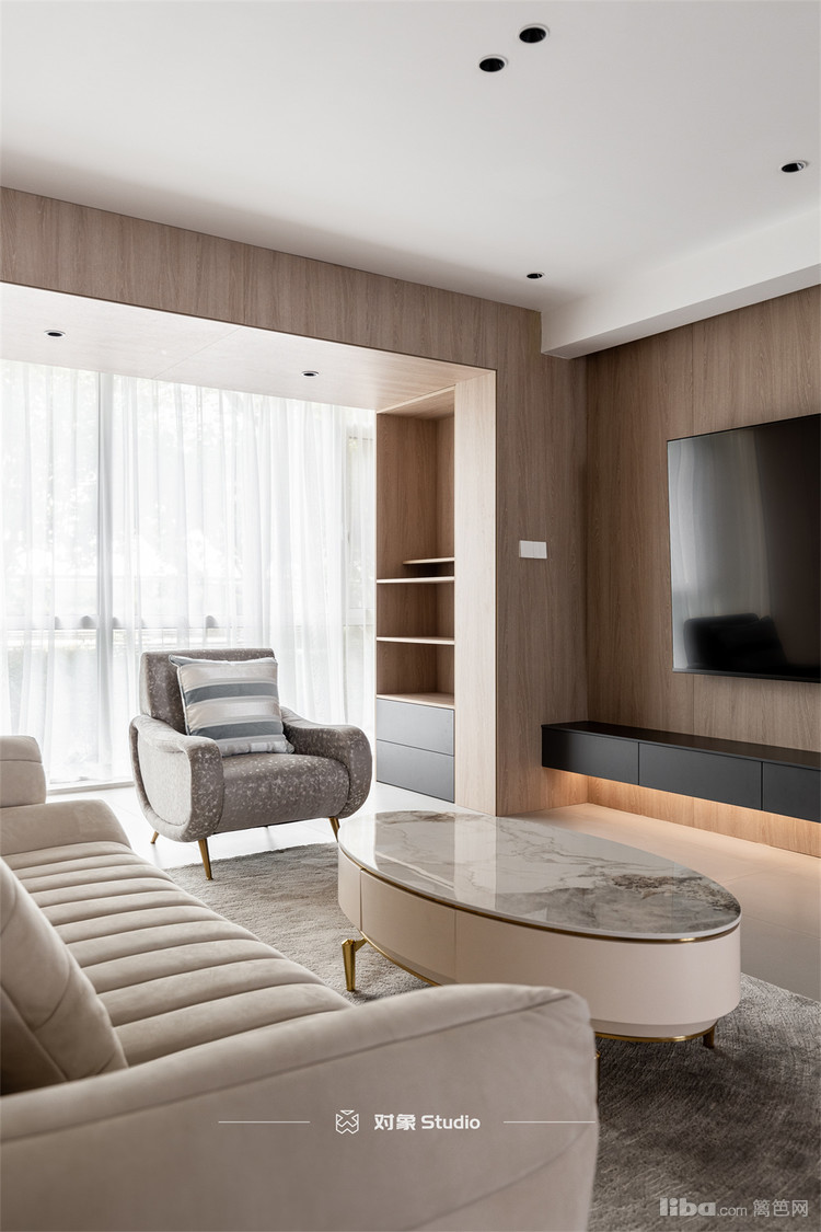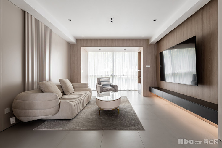 电视柜是做了悬空抽屉,木色点缀,与扶手呼应。高级灰的墙面与极简门组合,行程联动。