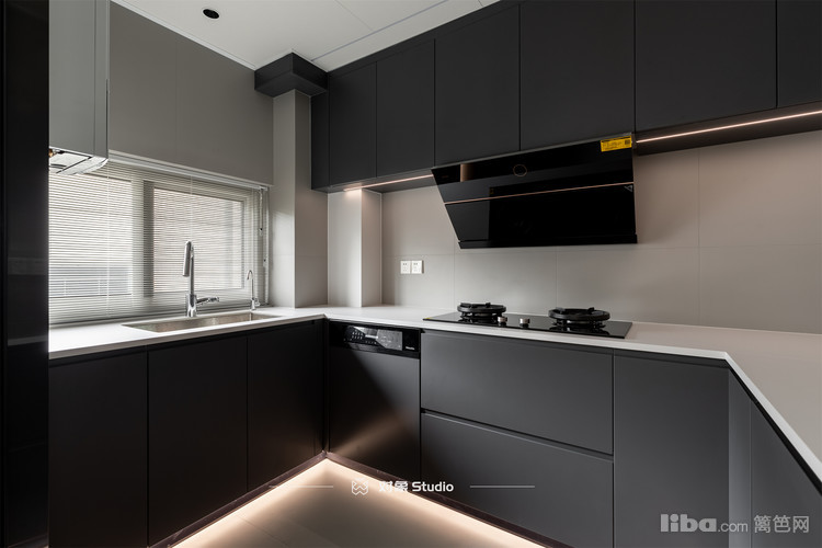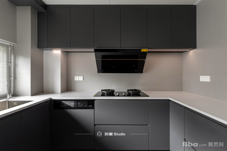厨房的门板和居乙家的一样是黑色肤感膜,考虑到厨房的窗户不大,怕采光上影响,墙面和台面采用了淡色对比