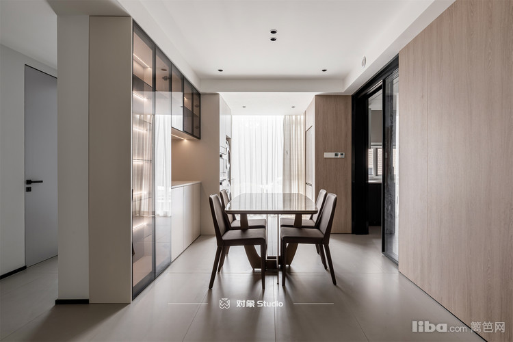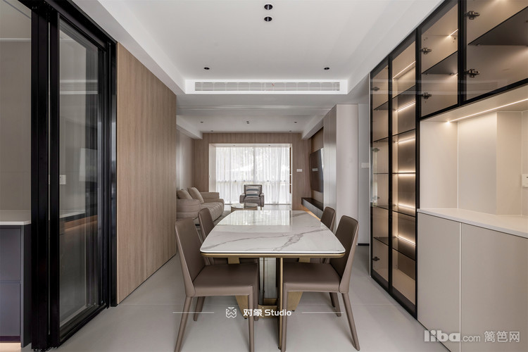 餐边柜用的是玻璃门板,反光出的木饰面特别柔和,效果很赞。
