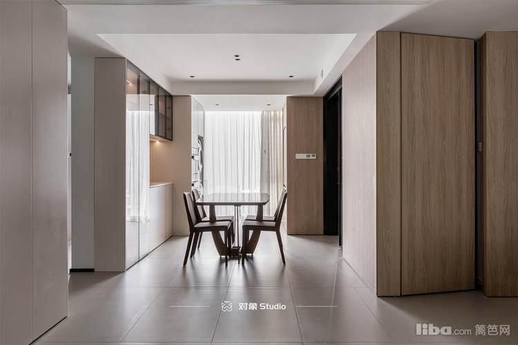 餐厅墙面是由次卧的隐形门整个饰面板包围过来,没有做大量留白。