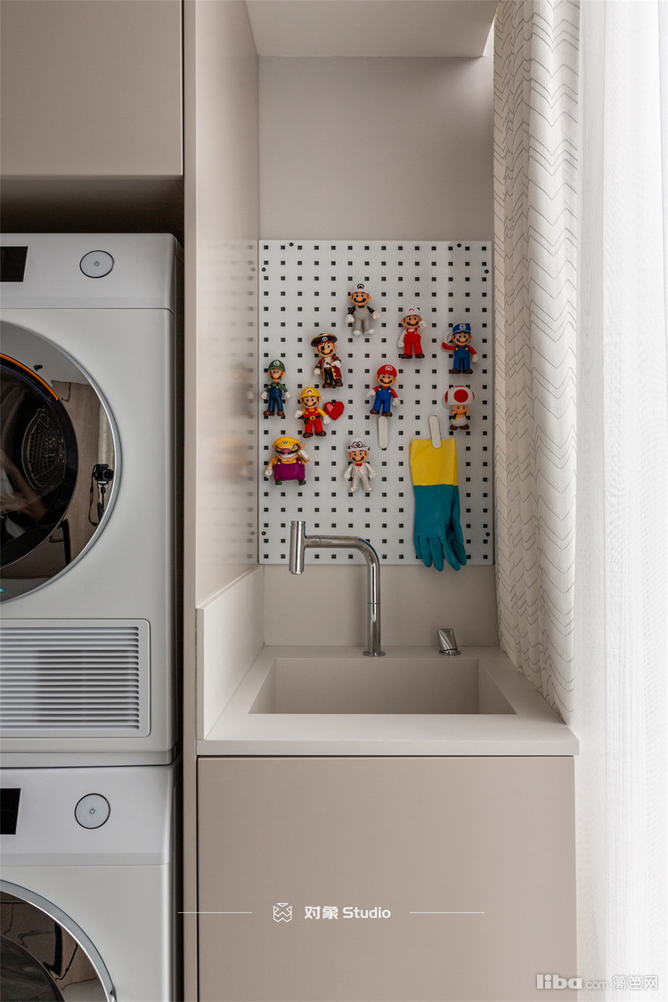 阳台的洗衣区,在墙上安装了洞洞板,放置了可爱的小玩偶,和夹子,既实用又增加了童趣