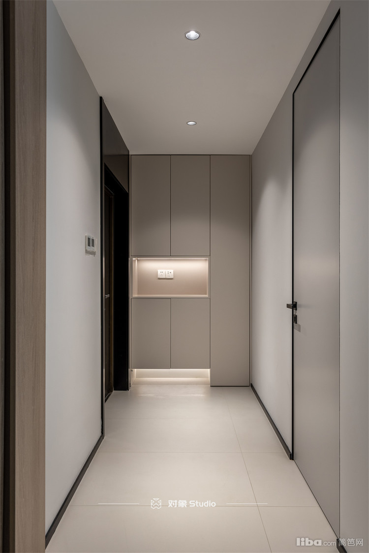 灰色墙面与门相呼应,无边框门搭配极窄金属踢脚线,整个进门视野非常清爽简洁。
