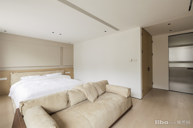白色床单与米色沙发相得益彰,深木色地板更显温馨。在这宁静的角落,享受惬意时光,品味生活的美好。