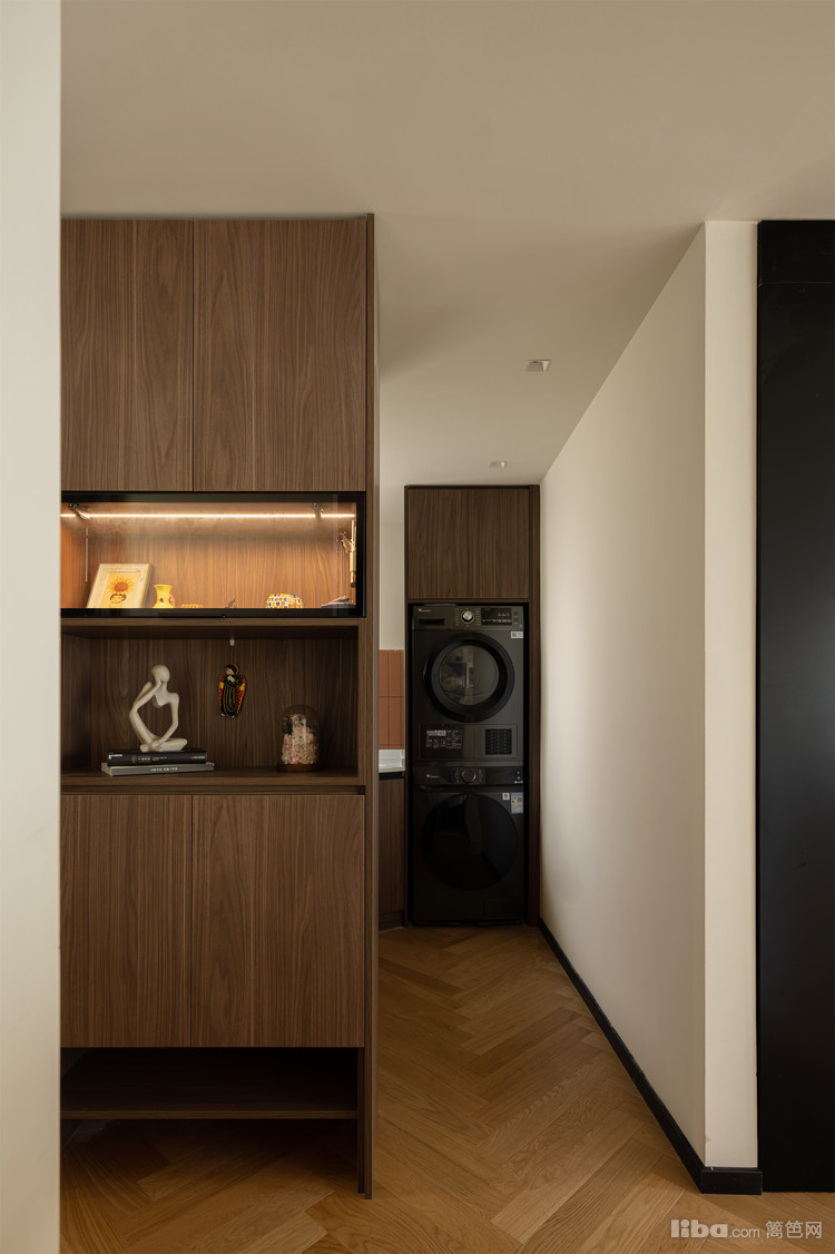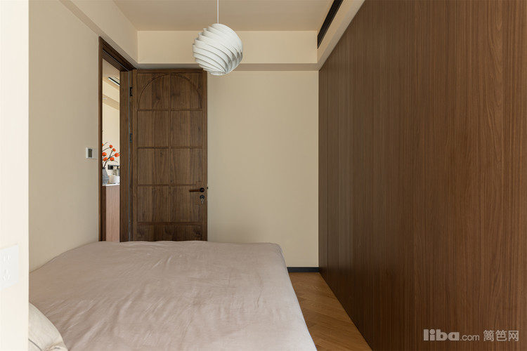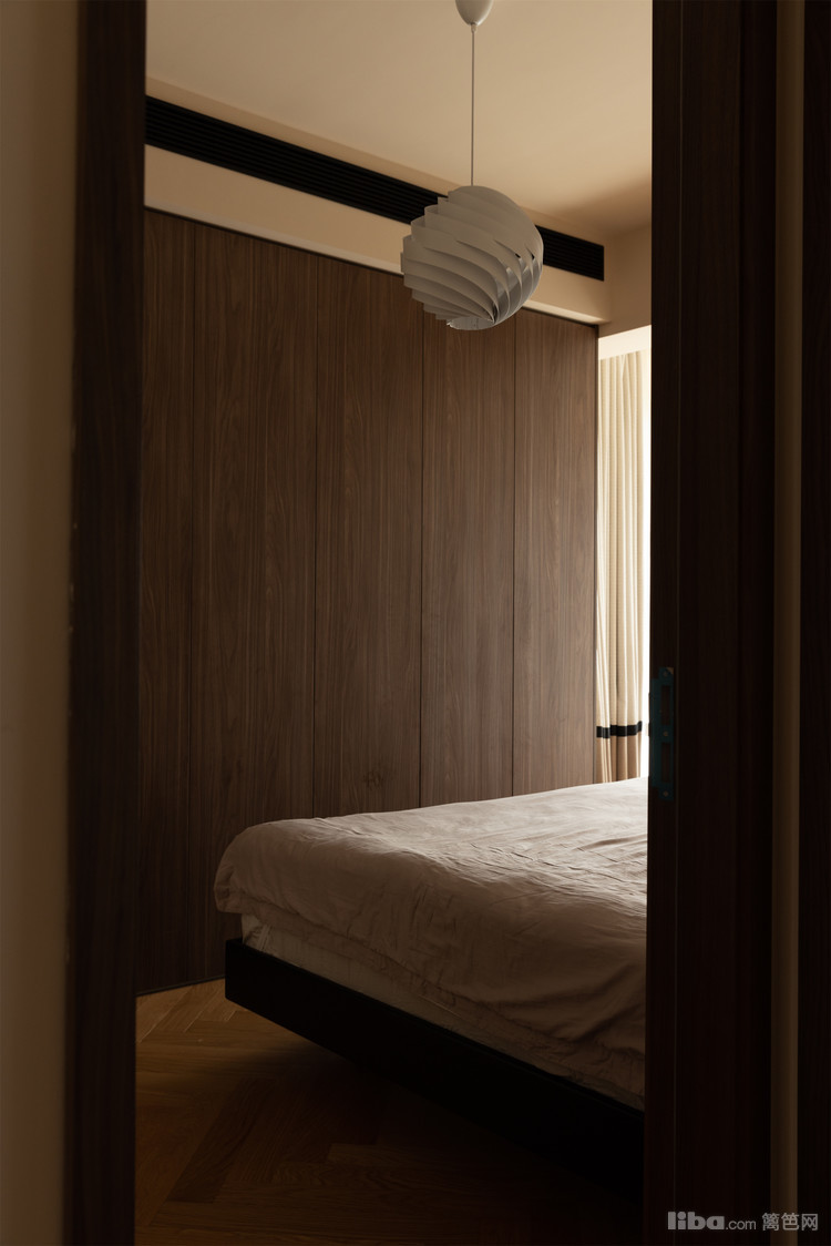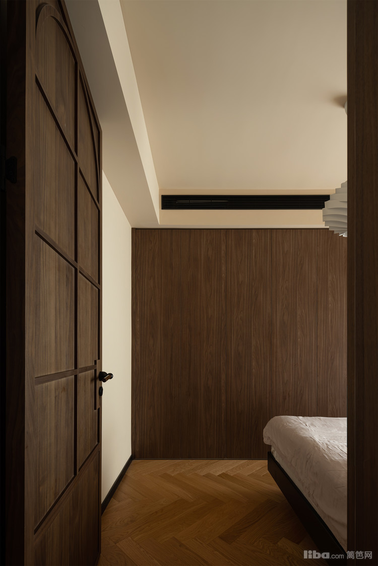 一门到顶的黑胡桃木衣柜,大气而实用,宛如艺术品般装点这个私密空间。