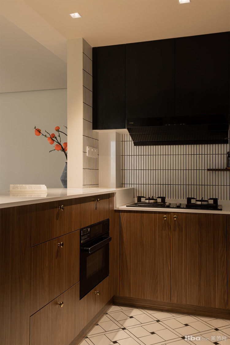 嵌入式烤箱精巧实用,全屋定制的橱柜以黑胡桃木打造,质感非凡,整体设计流畅统一。