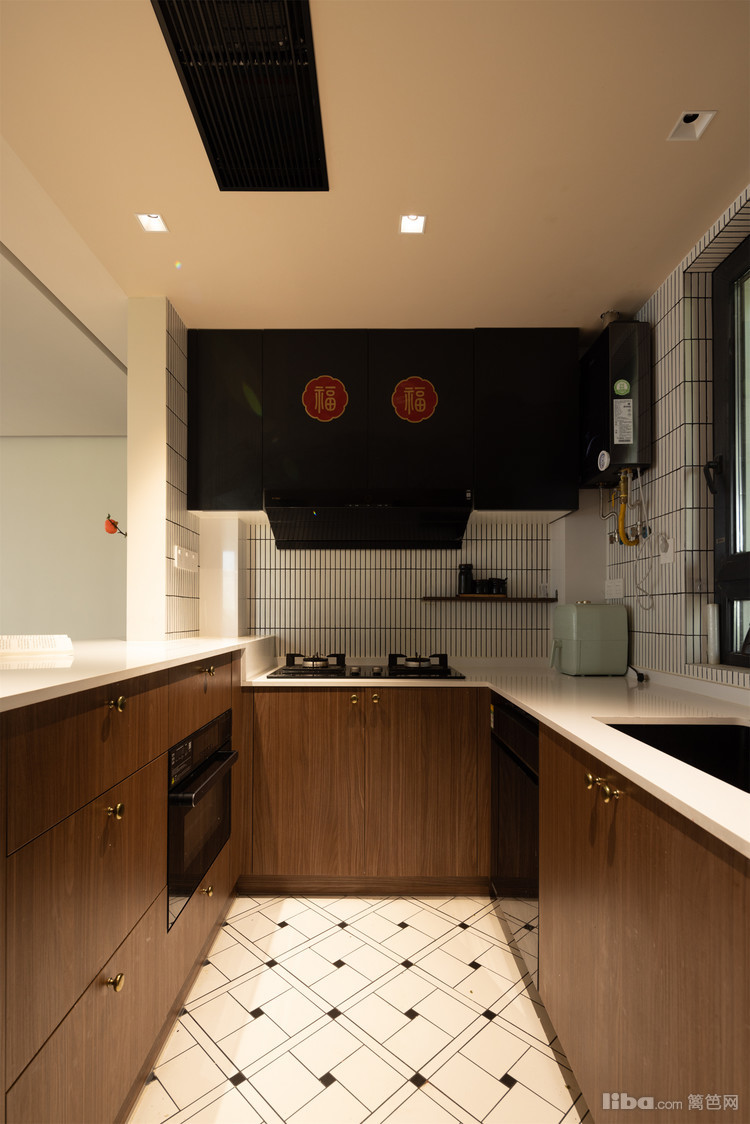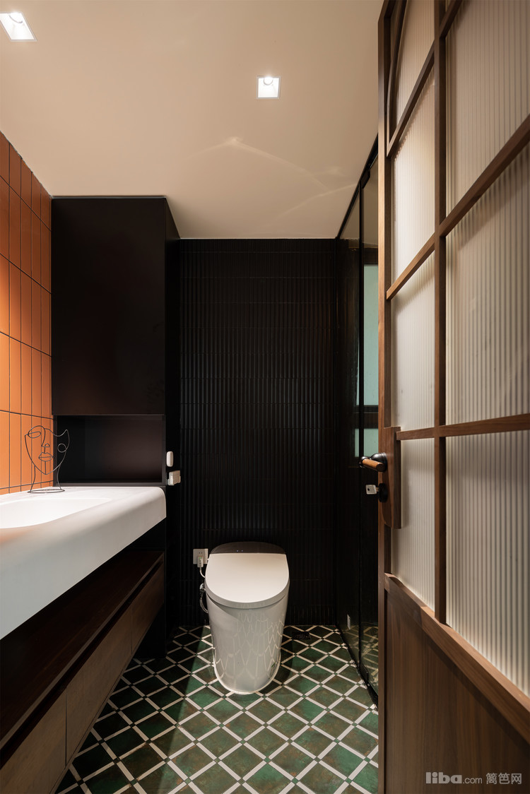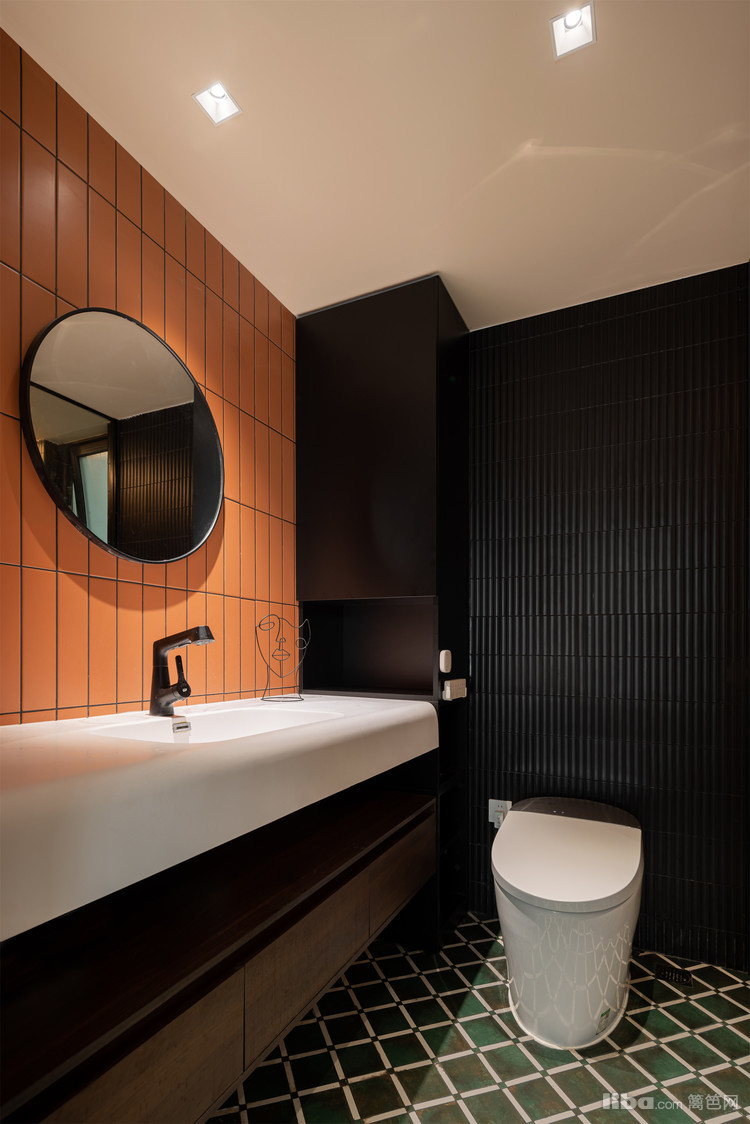 运用拼色小地砖,黑白方格交织,既展现了独特的时尚感,又保持了空间的整洁与干净。