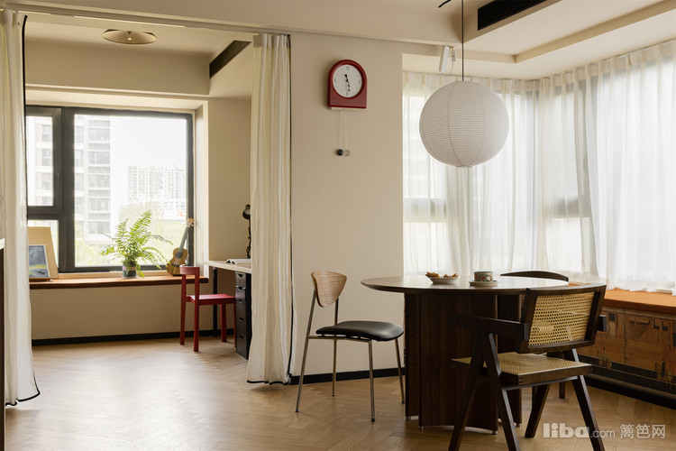 木质书桌与红色椅子相映成趣,书籍、绿植点缀其间。窗外高楼林立,而内心却宁静致远。