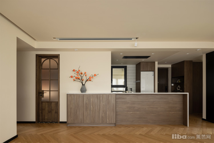 鱼骨拼地板与实木橱柜不仅增添了空间的层次感和艺术感,更显得时尚而别致。