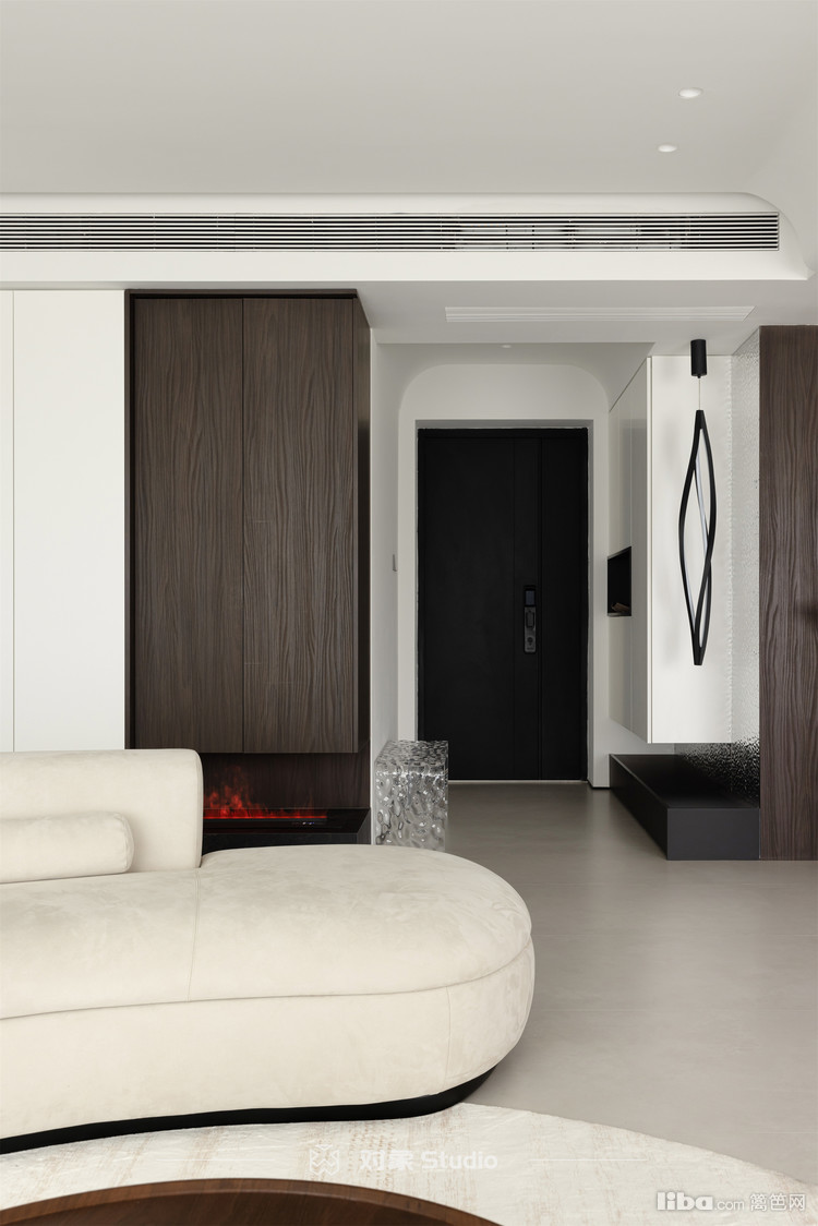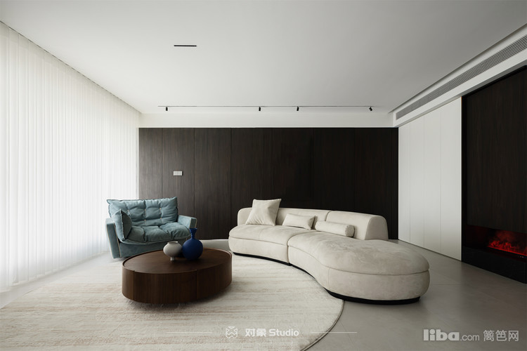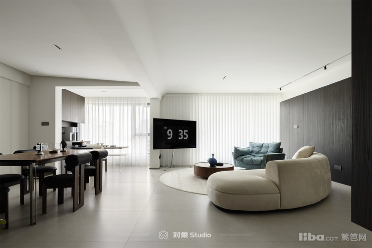 颠覆传统客厅布局,采用围合式设计,优雅地面向斜对角处的可移动显示屏,巧妙替代了传统电视机的位置。