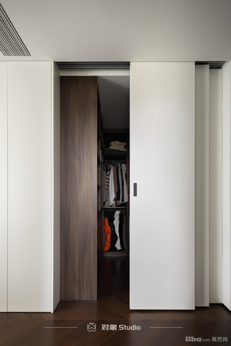 一门到顶的白色实木移门优雅地层叠展开,揭开了一处精致的私密空间——衣帽间