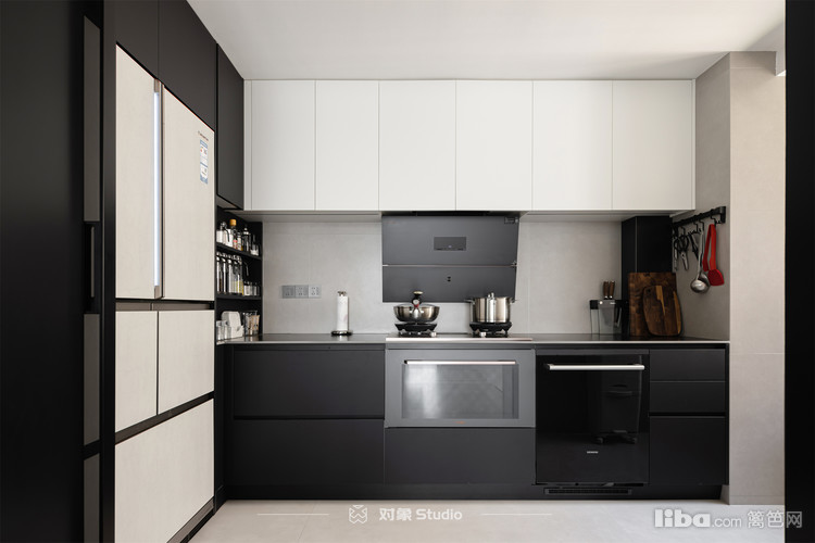 黑色橱柜与白色冰箱形成鲜明对比,彰显现代感与实用性。