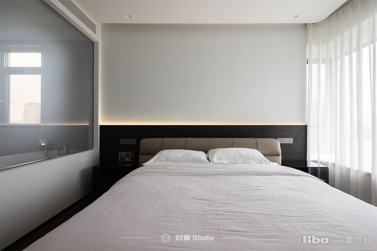 主卧与主卫之间的透明玻璃隔开,视觉上扩大了主卧的面积,借用主卧的光线,改善主卫的采光条件。