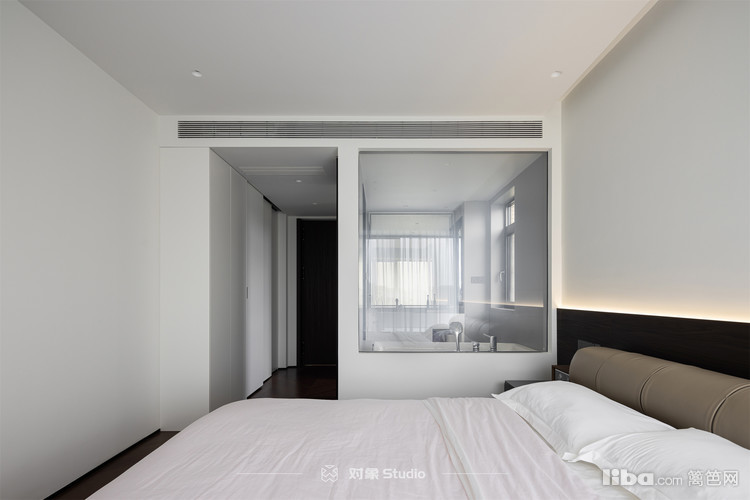主卧与主卫之间的透明玻璃隔开,看起来更加通透,视觉上扩大了主卧的面积,让卧室显得更加宽敞明亮。同时也借用主卧的光线,改善主卫的采光条件。
