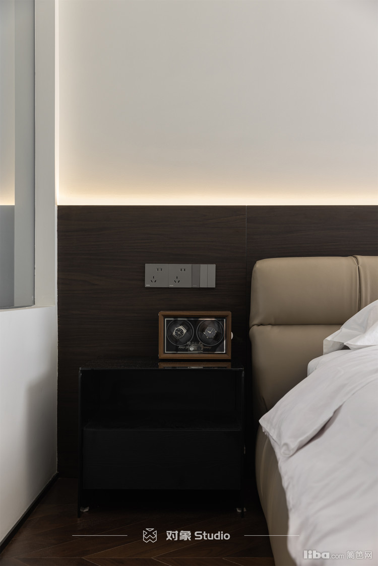灯带沿着背景墙的上沿优雅地铺展,勾勒出迷人的设计线条与层次感,光影交错间尽显简约之美。