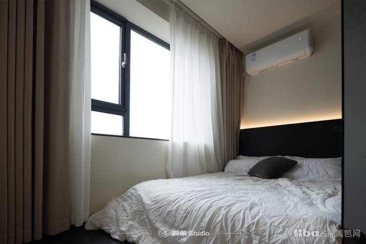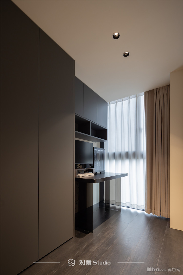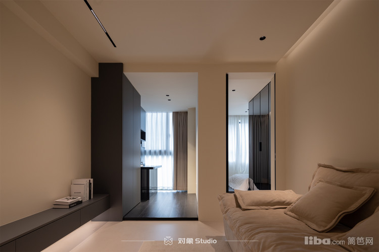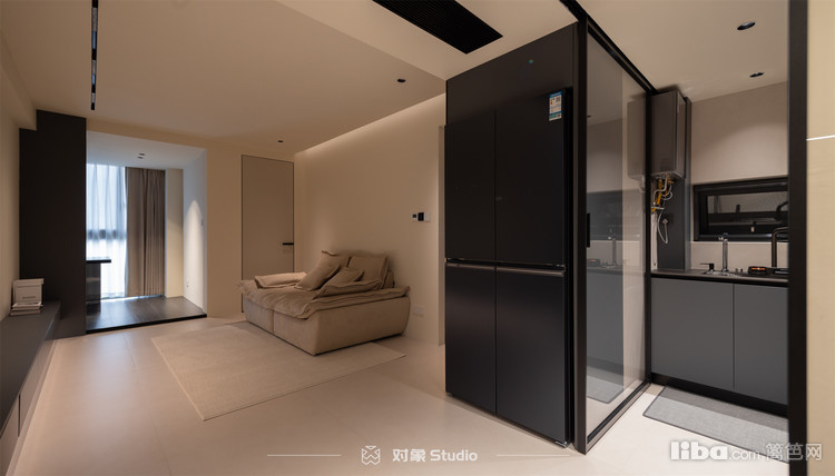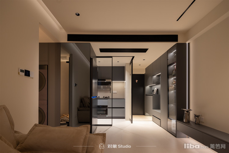 充满了稳重与质感的空间中,清透的玻璃门巧妙融入,小户型空间因此显得更加宽敞明亮。黑色门框不仅划分了区域,还带来一丝科技前卫的气息,与整体风格相得益彰。