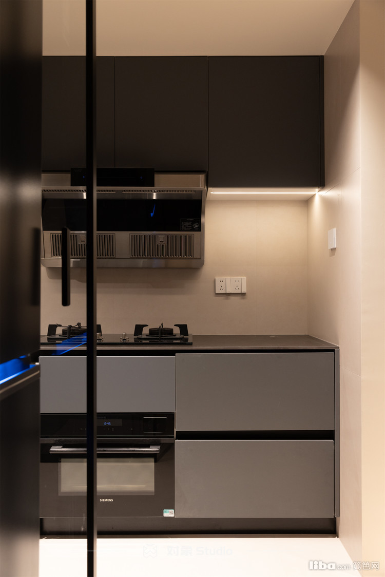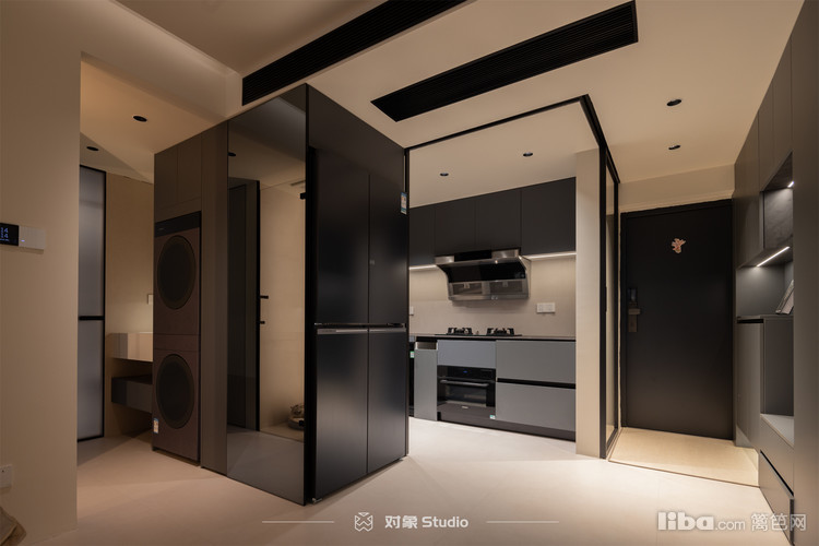 嵌入式冰箱侧面采用镜面打造,实用美观。再过去就是厨房,视觉连贯,操作动线便捷。
