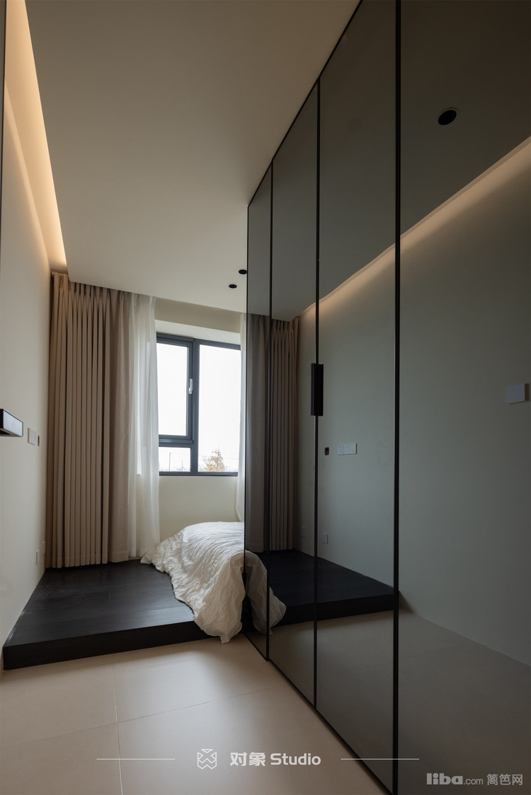 卧室打造了一个小地台,去除床边柜,可以减少耍手机的频率,让入睡更有仪式感。同时也为打造衣帽间腾出了很大的空间。