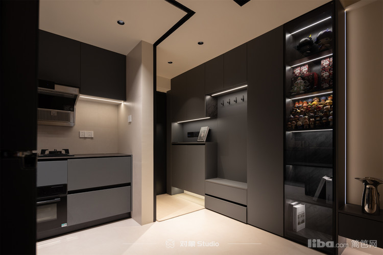 充满了稳重与质感的空间中,清透的玻璃门巧妙融入,小户型空间因此显得更加宽敞明亮。