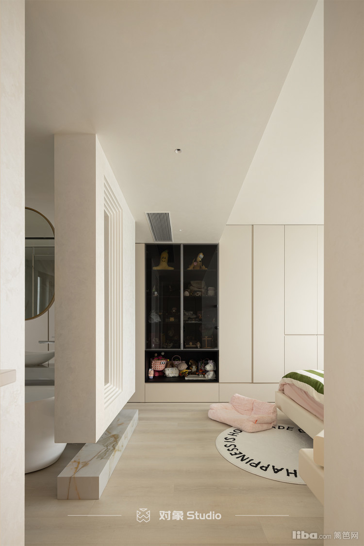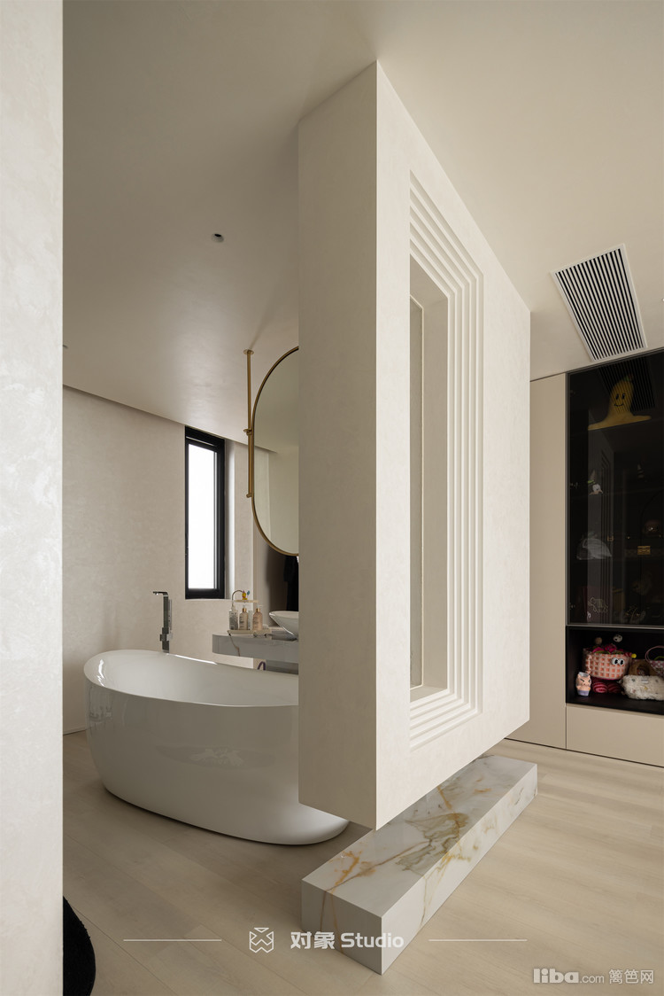 卧室是个套房,连着主卫及衣帽间,用叠级造型做划分,两边都可以进。洗手区、浴缸区、洗浴区还有马桶区都是四分离设计,整个空间围绕着台盆和浴缸区,形成了洄游动线。