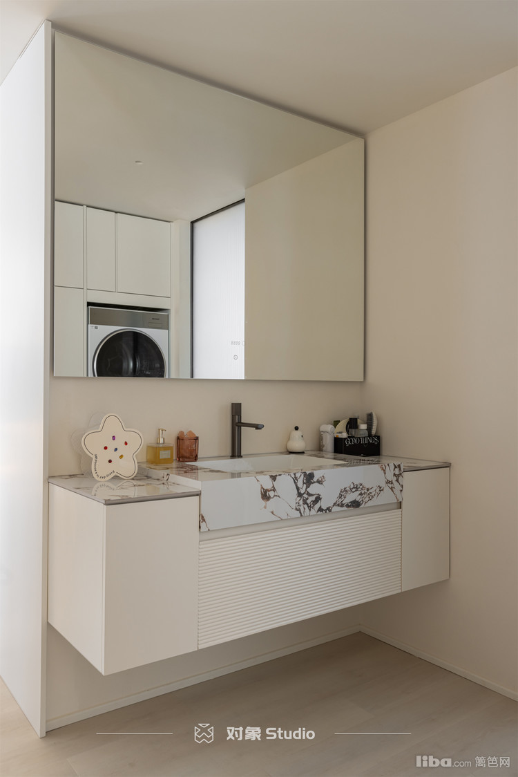 台盆区用了石晶的材料做台面,做了个台上盆,下方是置物区,可以放些生活用品。