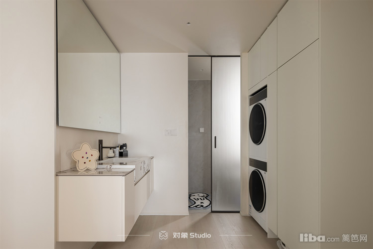 面对干区做了家政柜,全屋订制按照洗衣机的体宽做了一个对称化设计的柜门。