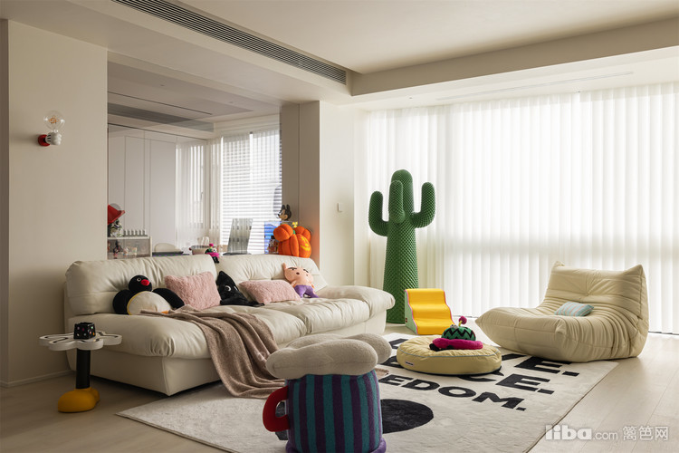 摆放了三人位沙发以及毛毛虫,去除了茶几,摆上了各种小摆件,整个氛围超级温馨~超大的仙人掌简直绝了!