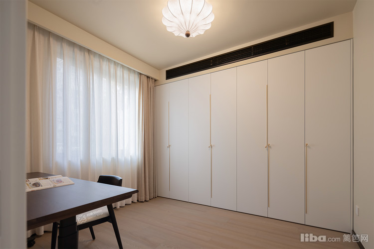 一门到顶的衣柜以绝对垂直的线条构筑极简骨架,亮香槟色法式把手则成为点睛之笔