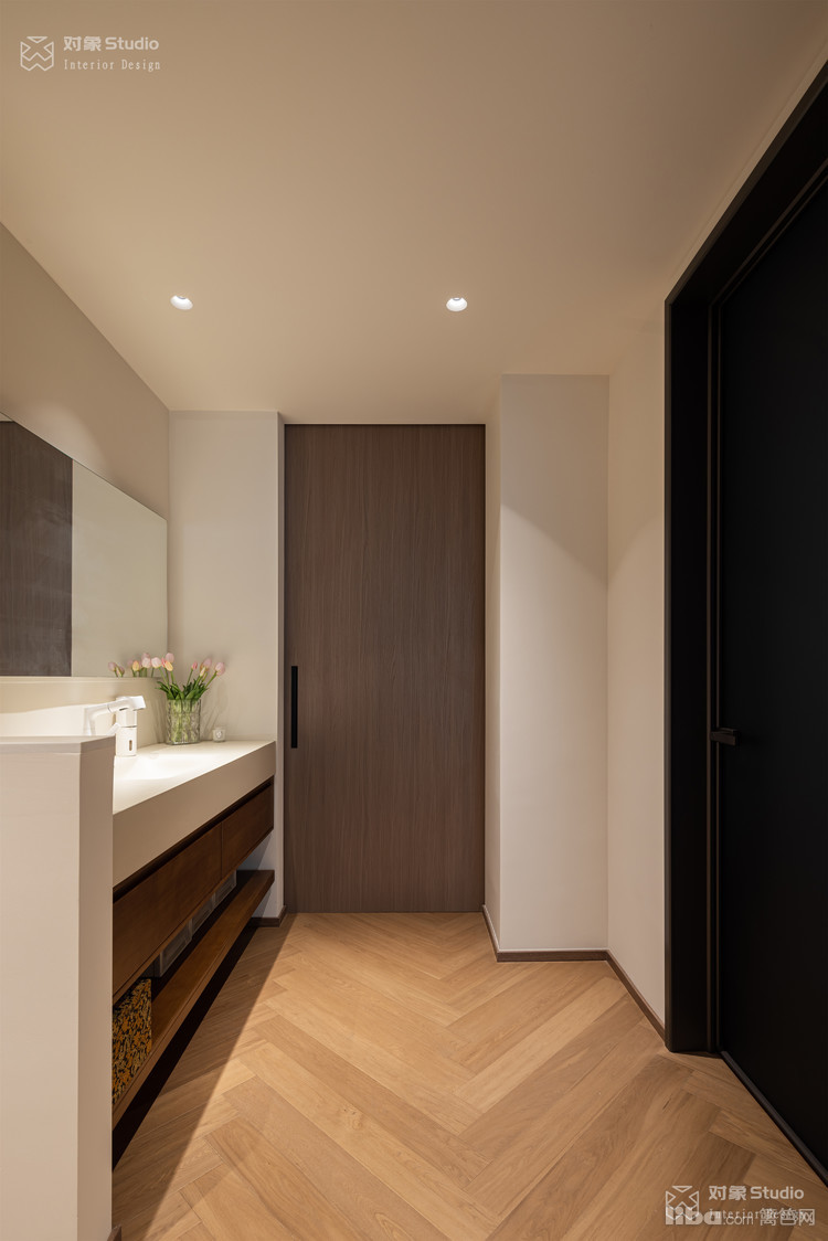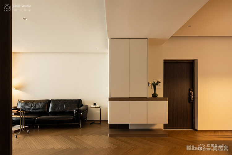 悬浮鞋柜: 进门右侧定制悬浮鞋柜,底部悬空设计减轻视觉负担,方便清洁,同时预留空间感。