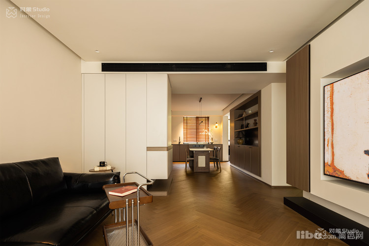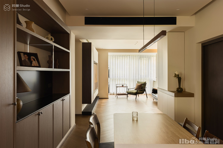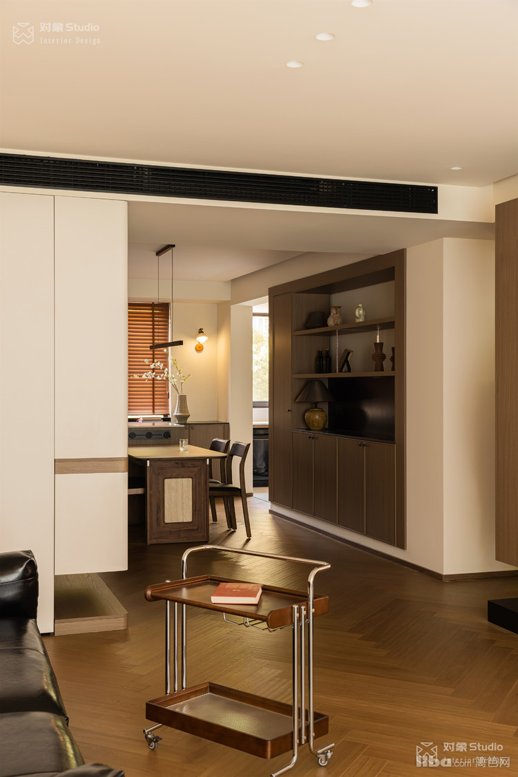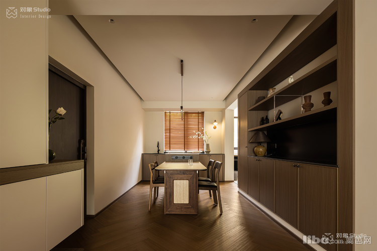 悬浮餐边柜: 餐边柜设计为无底板、无顶板形式,底部与墙体融合,营造“悬浮”于墙面的轻盈感与高级感。