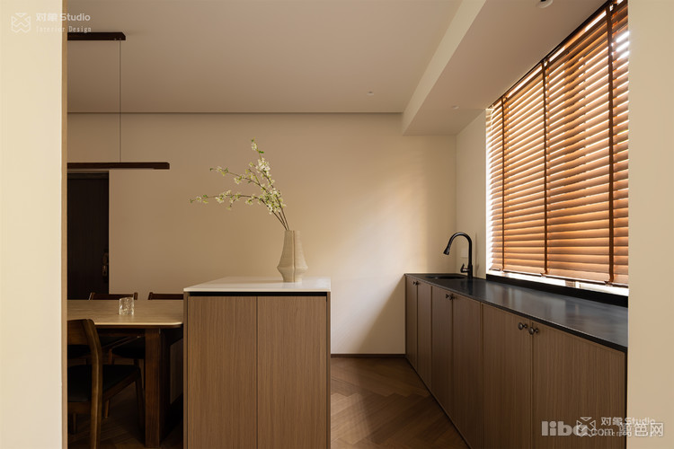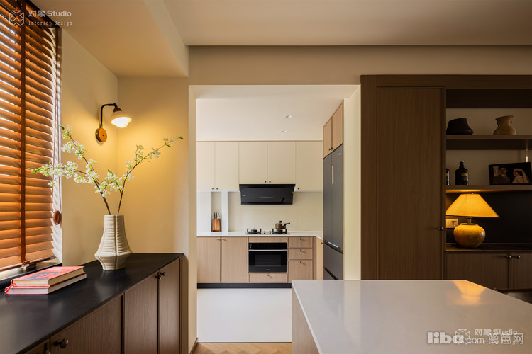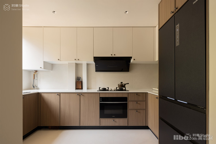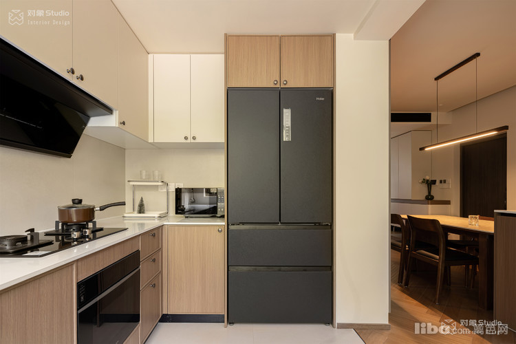 设计师还巧妙改造厨房闲置角落,借用客厅+厨房的边角空间,使冰箱嵌入式设计,保证功能与整洁美观。