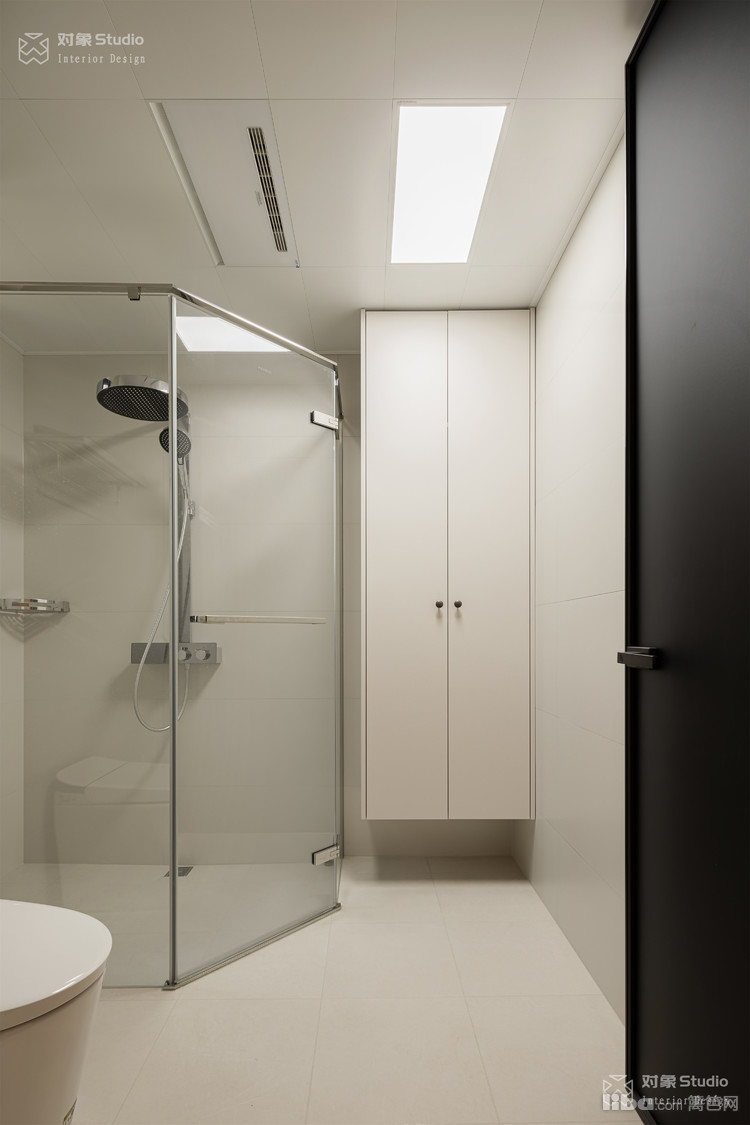 透明淋浴房,显得通透。淋浴房旁设置了个柜子,存放洗浴用品。