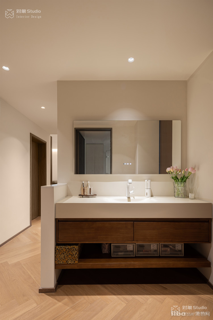 卫生间采用干湿分离,洗手台的复古木质柜体搭配一体式台盆,既具韵味又便使用。