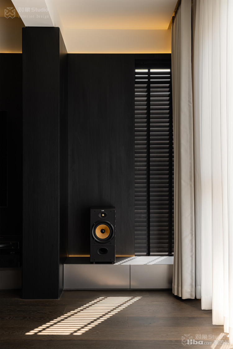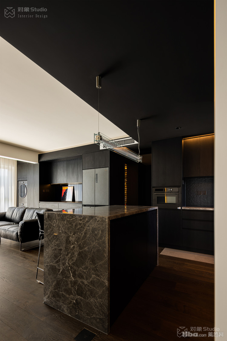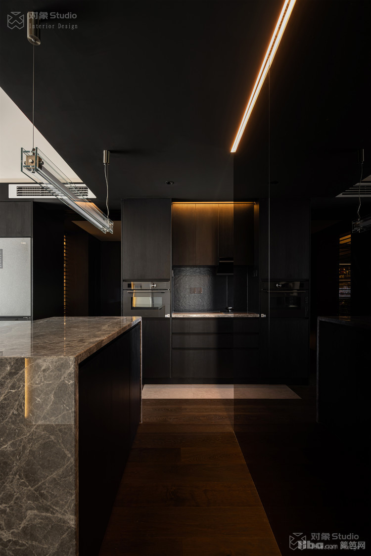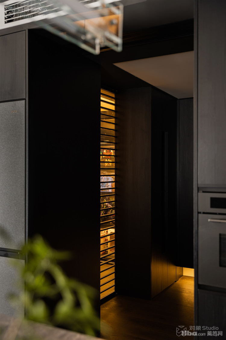 特意收集了多种不同光感的黑色材质:哑光木饰面吞吐着温润的呼吸,高光黑玻璃倒映着理性的秩序,镜面不锈钢则切割出虚实交错的维度。