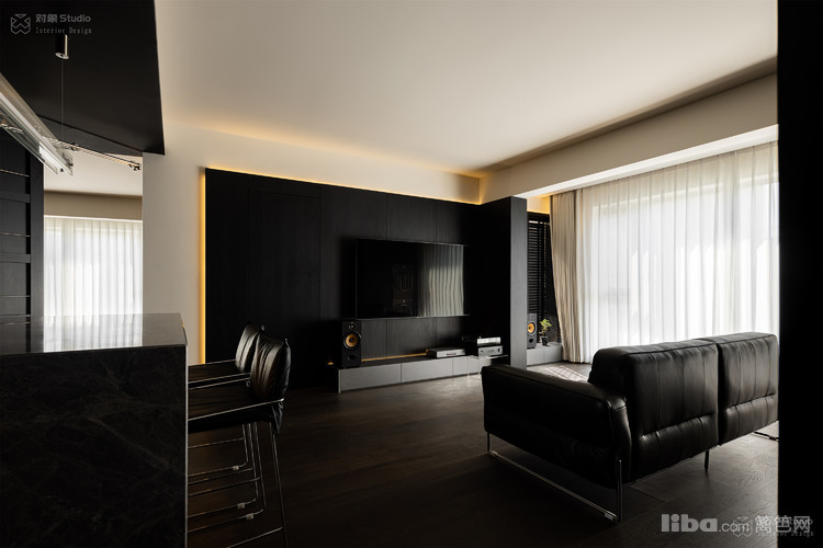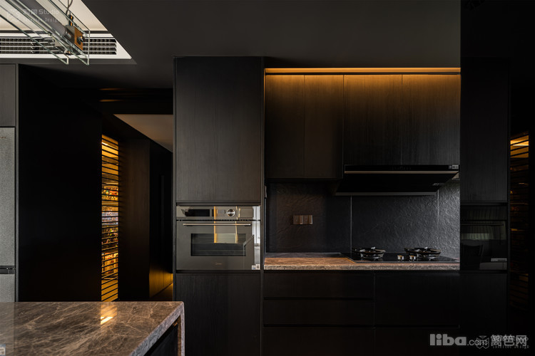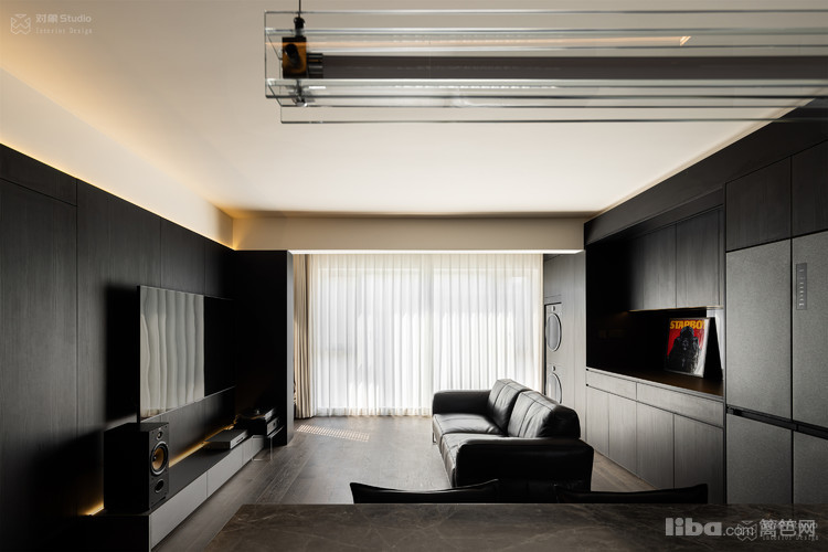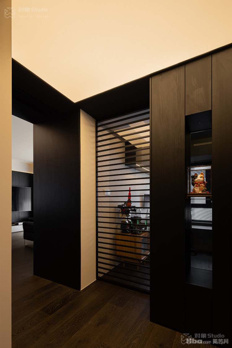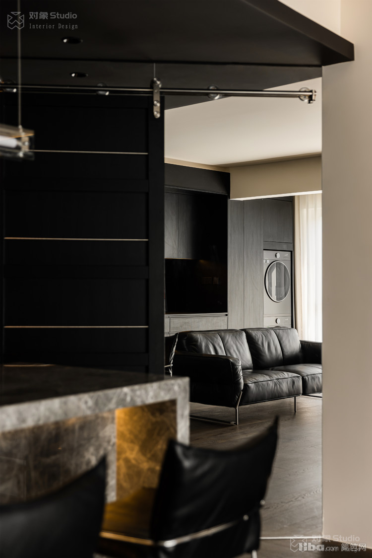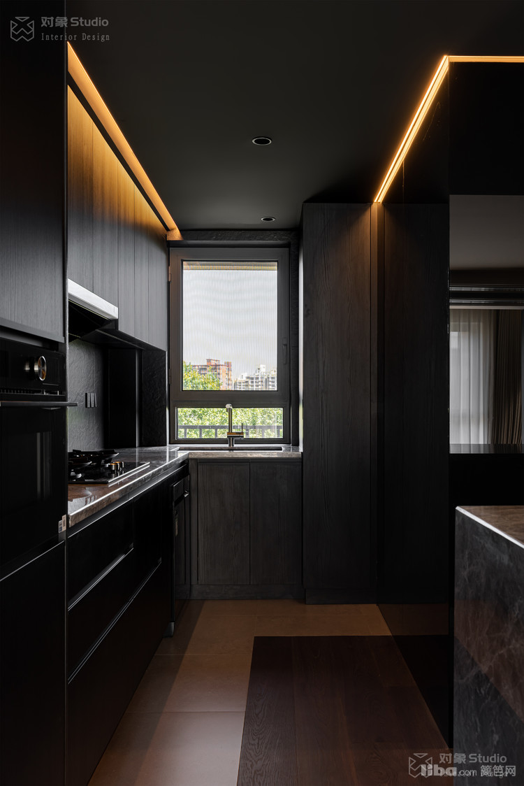 特意收集了多种不同光感的黑色材质:哑光木饰面吞吐着温润的呼吸,高光黑玻璃倒映着理性的秩序,镜面不锈钢则切割出虚实交错的维度。