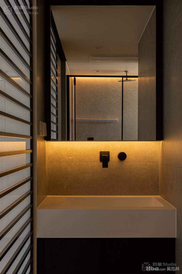 手台采用了预埋式龙头让水系统出水别致,镜柜灯带延续了无主灯照明的设计哲学。