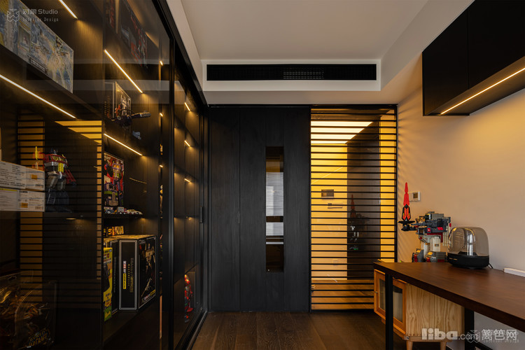 来到整个房子最贵的区域——电竞房,双扇玻璃无框设计消解了视觉割裂,将限定手办转化为空间核心艺术品,让价值展示与电竞激情在光影中完美融合。
