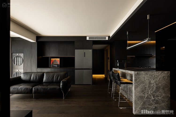 背后黑色系的餐边柜、嵌入式冰箱与阳台嵌入式洗烘一体形成水平延展,功能模块的精准排布既提升效率。