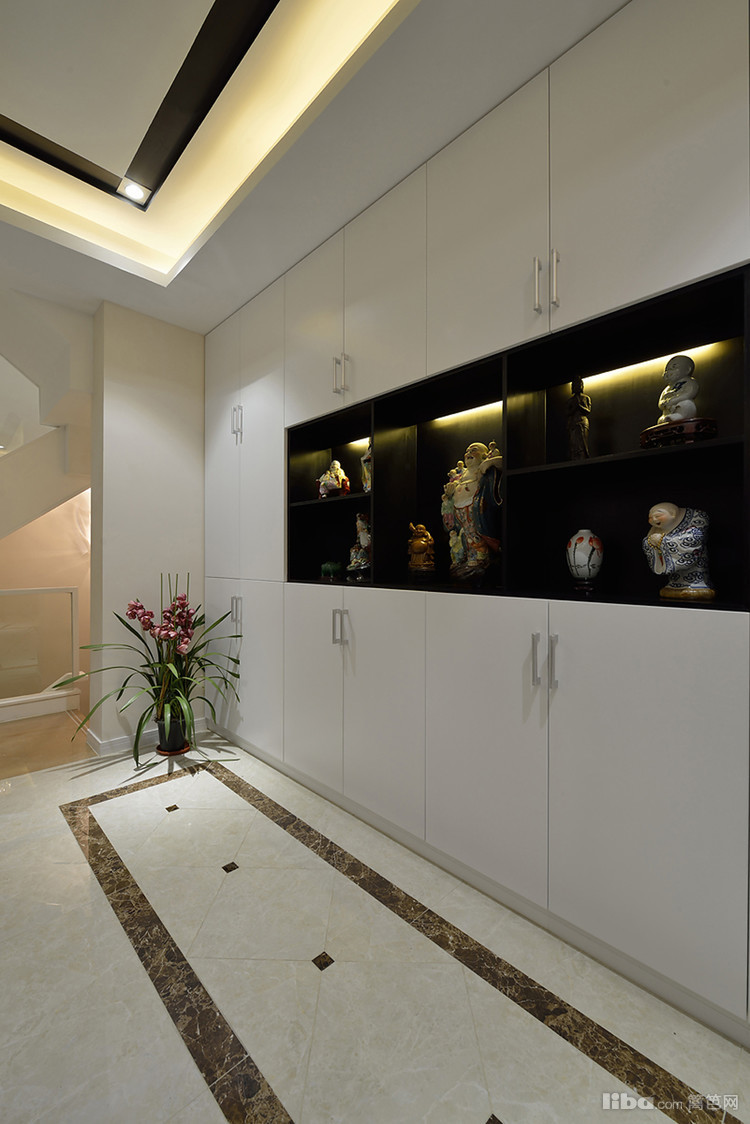 进门处,右边的衣帽间和雨伞柜将门厅与客厅区域作有机的区分,不仅有效保证私密性,也使入户的动线更加简洁有序。同时收纳的功能性可谓强大,地面设计上,不同颜色的大理石和地砖通过切割与拼接