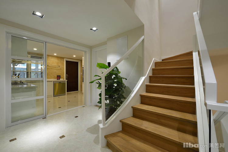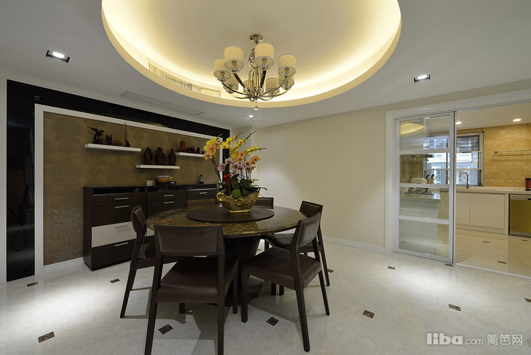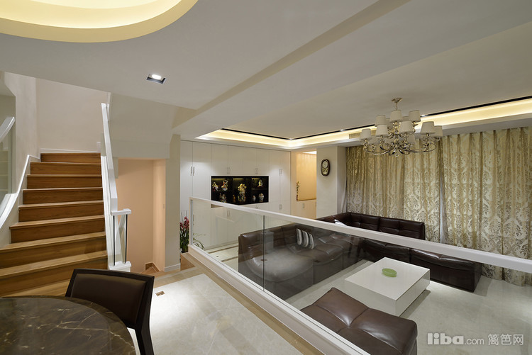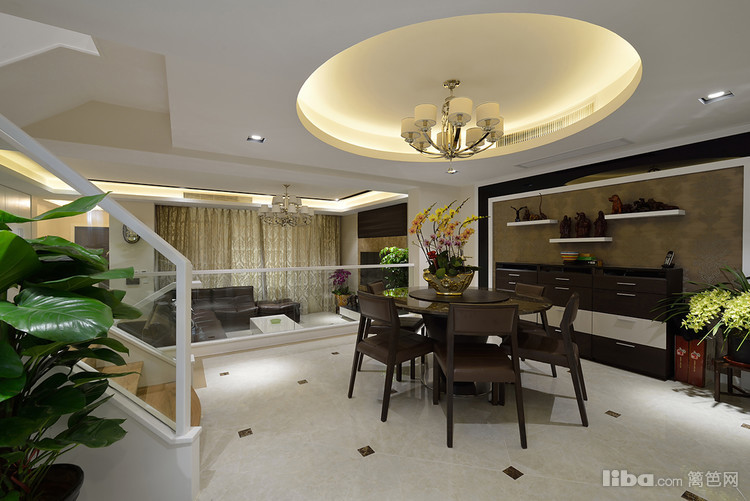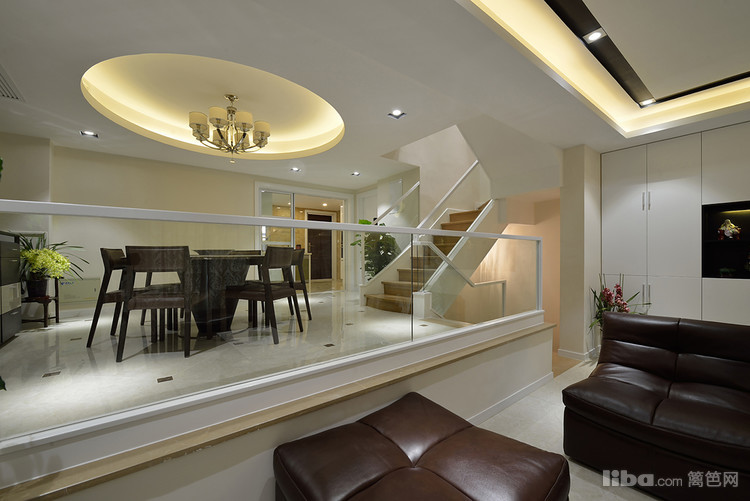 圆形餐桌寓意团团圆圆,一家人其乐融融、温情万分,为此吊顶也以圆形来呼应。餐厅的隔断放弃了传统的木制栏杆,采用大面积的整块透明玻璃搭配白色扶手,让空间视觉更为开阔。