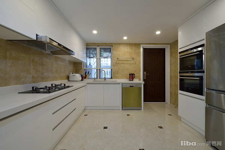 厨房所在,取色上和餐厅一脉相承,并添加了大面积的明黄色,让色彩有了些许跳跃。对开门冰箱与烤箱摆放与吊柜齐平,整体设计极具前卫时尚,且豪华气派,提升了厨房的整体品质。